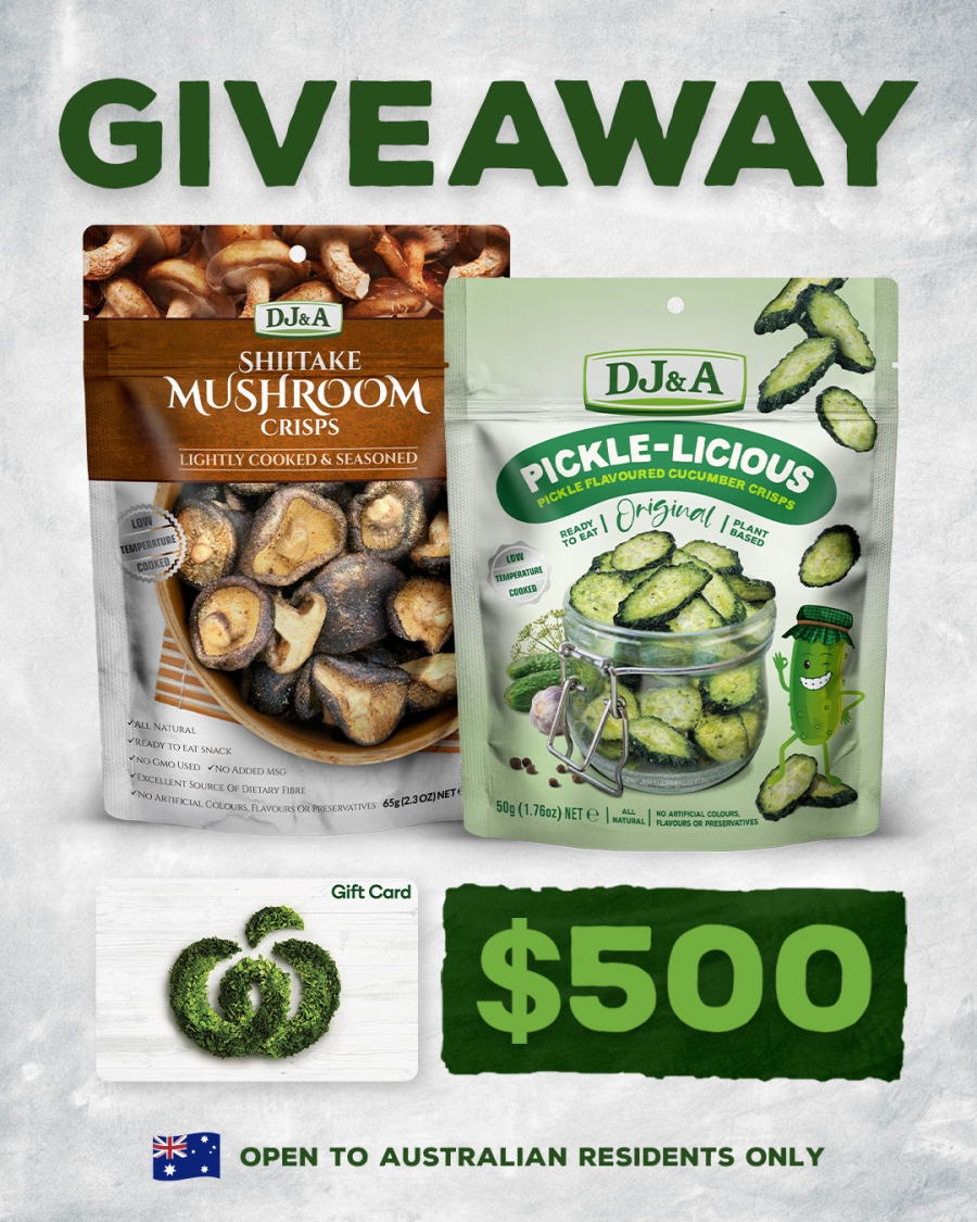 DJ&A SNACK BIG GIVEAWAY! We’re giving one lucky Aussie the chance to WIN a $500 Woolworths gift card! Perfect for grabbing all your favourite DJ&A snacks — from our crunchy Shiitake Mushroom Crisps to the tangy Pickle-Licious Pickle Flavoured Cucumber Chips.